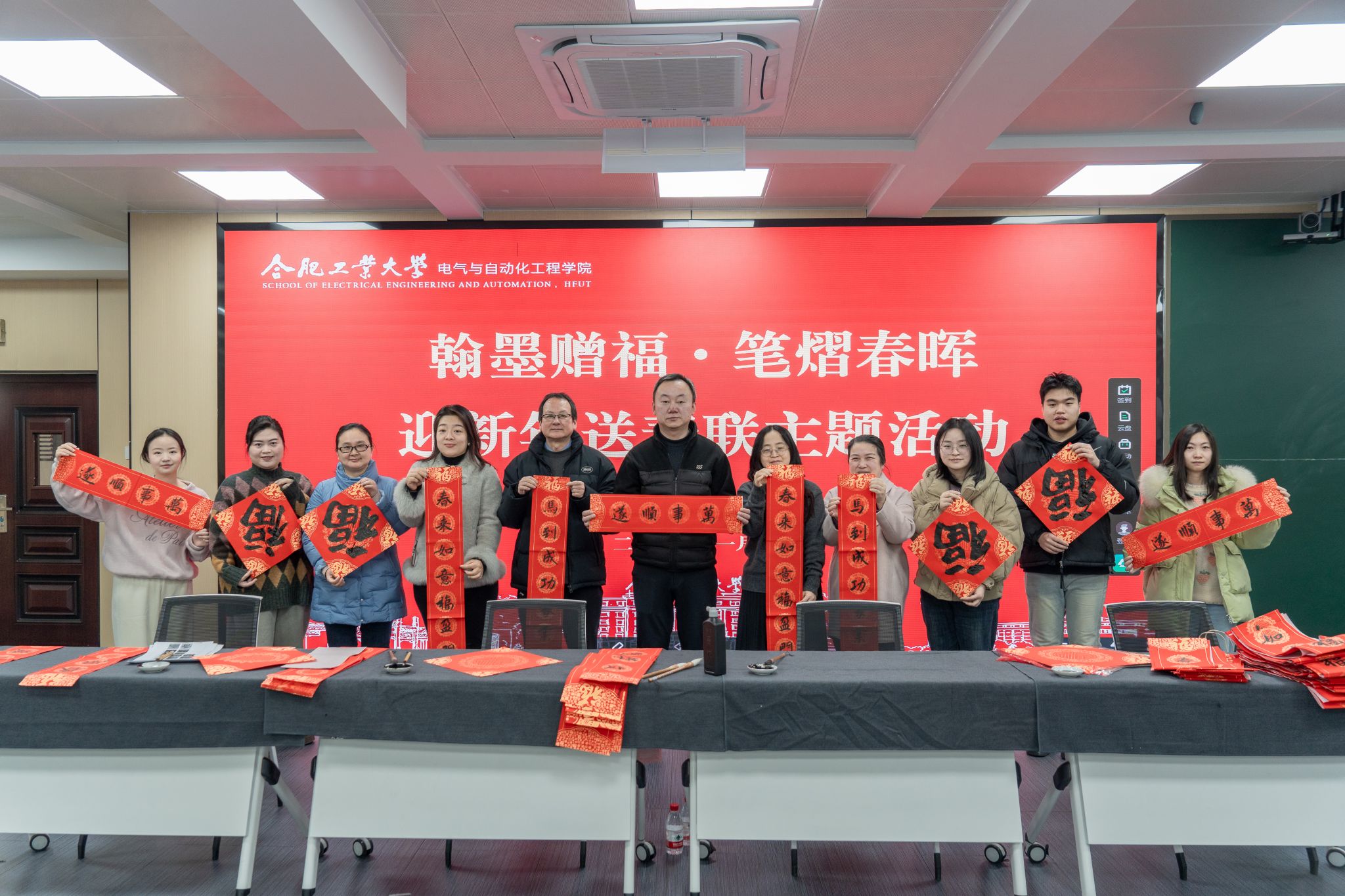 在逸夫楼1005会议室举办“翰墨迎春,福满电院”送春联活动。教师代表、大学生书画协会学生代表,为全院教职工现场书写春联、定制福字。